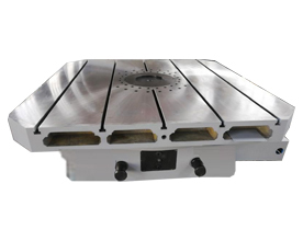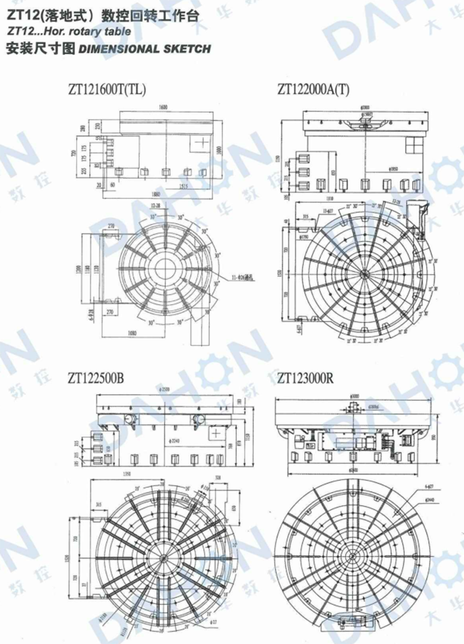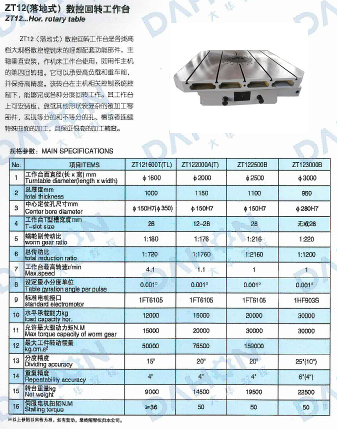 ZT12 (落地式) 數控回轉工作臺是各類大規格數控鏜銑床的理想配套功能部件,主軸垂直安裝,作機床工作臺使用,即用作主機的第四回轉軸。它可以承受高負載和重車削,并保持高精度。該轉臺在主機相關控制系統控制下,能夠完成各種分度回轉工作。其工作臺上安裝板、盤或其他形狀較復雜的被加工零部件,實現等分白的和不等分的孔、槽或者連續特殊曲面的加工,且保證很高的加工精度。